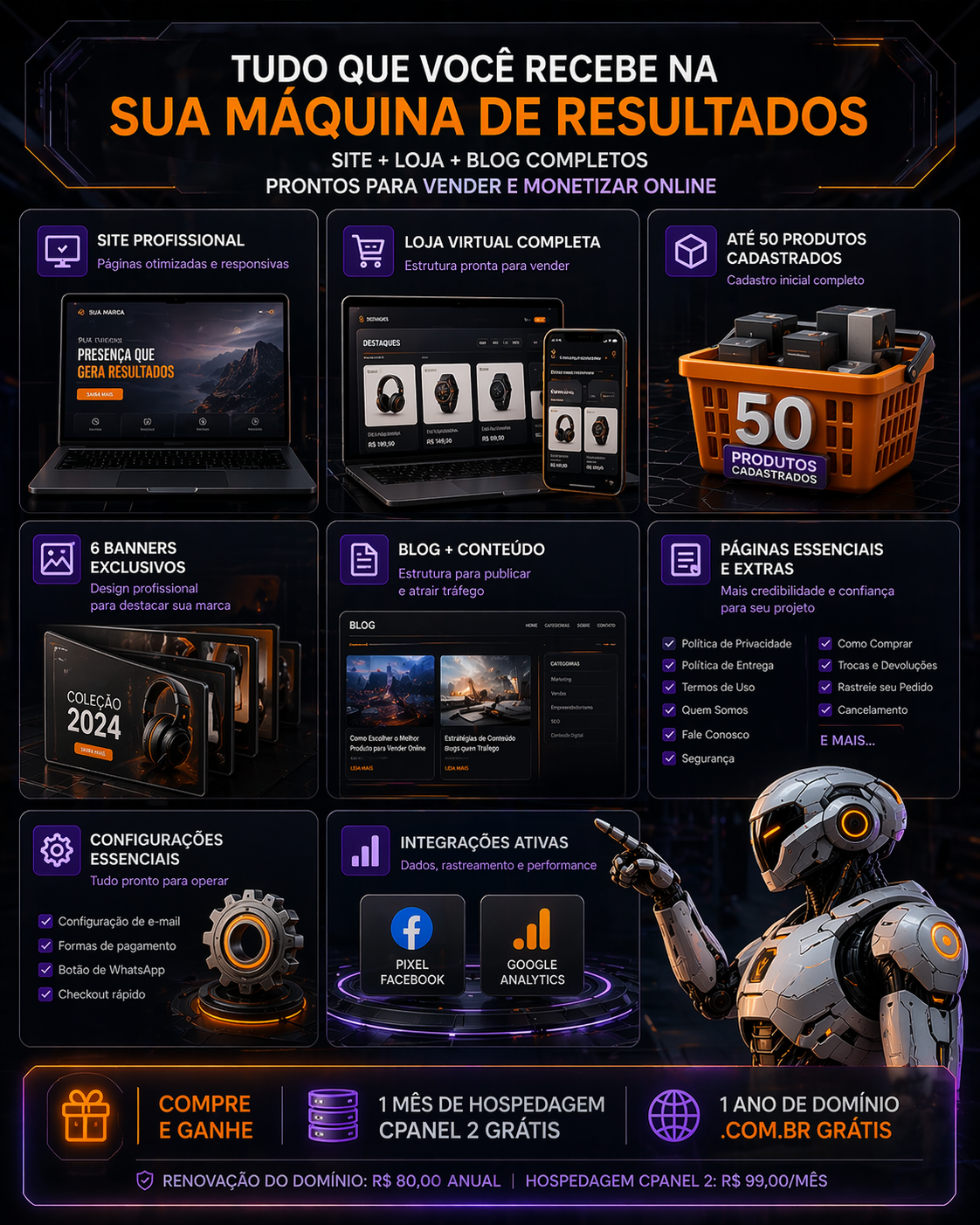 1 Ano de Domínio (.com.br), 30 dias de Hospedagem |